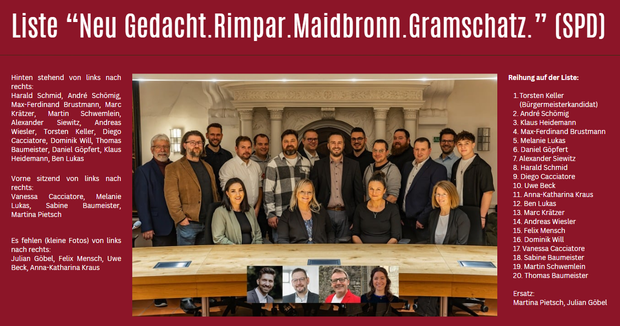 In der Wahlperiode 2020-2026 sind wir mit 4 Personen im Marktgemeinderat vertreten und wollen soziale Politik für die Bürger*innen von Rimpar, Maidbronn und Gramschatz fördern und durchsetzen. In der Geschichte der Marktgemeinde Rimpar kann keine andere politische Organisation auf eine so lange Tradition zurückblicken wie unser SPD-Ortsverein. Bereits 1907 wurde der Ortsverband gegründet.